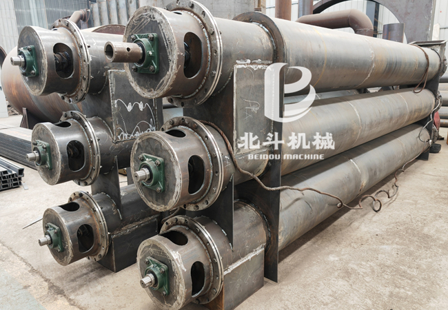 冷炭出料机采用夹层水套设计,内外筒体夹层为冷却水通道,内筒采用螺旋推进物料,提高了冷却效果,降低了成品炭温度。通过夹层冷却水不断带走内筒物料的热量,使高温的成品炭冷却到常温。